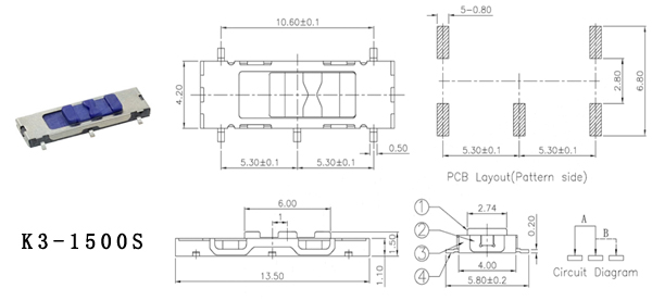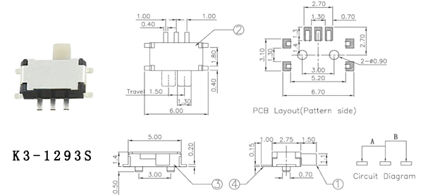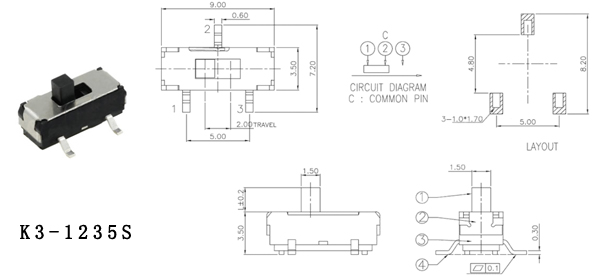 K3-1336S貼片四腳三檔撥動開關電路接線圖: